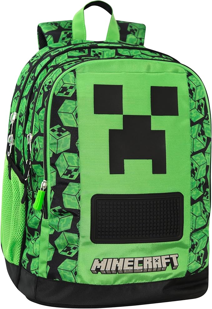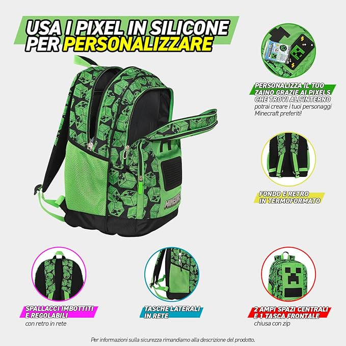 Zaino Scuola Ufficiale Minecraft, con 2 Ampi Spazi Centrali, Tasca Frontale Sagomata, Tasche Laterali in Rete, Spallacci Regolabili Imbottiti, Retro e Fondo Termoformati, 32x43Hx23cm